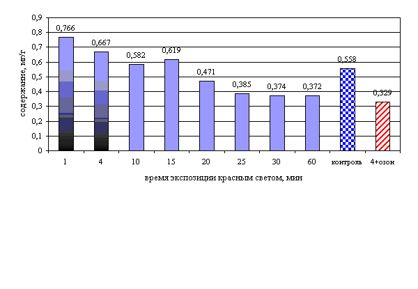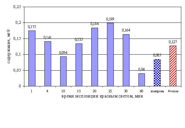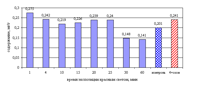 (мг/г сырой массы) у проростков, росших на воде, обработанной красным светом в течение 1, 4, 10 и 15 минут, было выше, чем в контроле (рис.4). Озонирование снижало содержание этого пигмента почти в 2 раза. Учитывая, что накопление сухой биомассы, которое является отражением фотосинтетических процессов, при озонировании существенно не снижалось по сравнению с вариантом без озонирования, можно предположить, что эффективность работы пигментного аппарата при озонировании существенно повышалась. В то же время, более высокая концентрация хлорофилла а