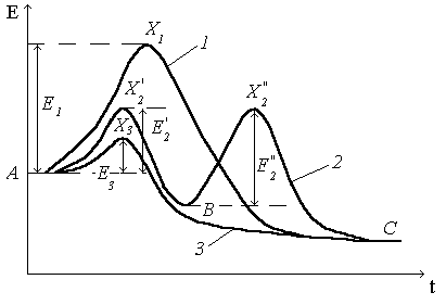 С законом Аррениуса связано широко распространенное в химии символическое изображение пути реакции в виде энергетической диаграммы, показанной на рис. 2. На данном рисунке представлено изменение энергии без катализа (кривая 1) и при участии катализатора (кривые 2 и 3). Кривая 2 с двумя максимумами соответствует образованию одного промежуточного продукта. Число стадий и промежуточных продуктов бывает часто значительно больше. Взаимодействие реагирующих веществ с катализатором может и не приводить к образованию стабильной формы промежуточного соединения (кривая 3). Но и в этом случае катализатор входит в состав активного комплекса и взаимодействие реагирующих веществ с катализатором определяет реакционный путь. Если энергии активных комплексов всех стадий реакционного пути с участием катализатора ниже энергии активного комплекса реакции без катализатора (т.е. E’