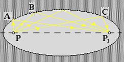 находятся внутри зеркальной поверхности. Принцип Ферма требует выполнения следующих равенств:  Кривая, для каждой точки которой сумма расстояний до двух заданных точек (фокусов) имеет одно и то же значение, представляет собой эллипс. Поэтому фокусировка выходящих из точки Р
