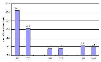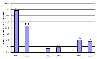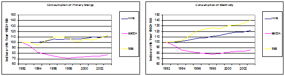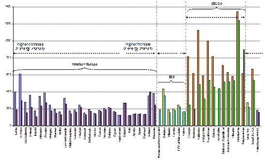 В странах ВЕКЦА общее потребление энергии от первичных источников значительно сократилось в 1990-е гг., главным образом в результате политических изменений и экономической реструктуризации, в сочетании с ограниченными вложениями в мероприятия по повышению эффективности. Несмотря на тенденции роста с конца 1990-х гг., к 2003 г. все еще не восстановились показатели 1992 г. Энергопотребление на единицу ВВП по-прежнему наиболее значительно в Северо-Западной Европе.
