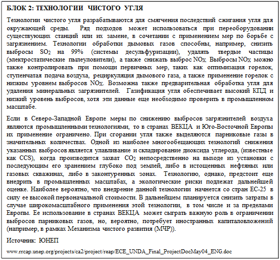 в Панъевропейском регионе снова начало расти в конце 1990-х. К 2003 г. оно еще не достигло уровня 1992 г. Несмотря на более чем 50%-ную зависимость Северо-Западной Европы от импорта угля, ожидается дальнейший рост использования угля, поскольку высокие цены на нефть и газ, а также озабоченность надежностью поставок стимулируют возврат к производству электроэнергии на основе угля во всех трех регионах (Юго-Восточной, Северо-Западной Европе и ВЕКЦА). Данная тенденция опасна с точки зрения сопутствующего увеличения неблагоприятного воздействия на окружающую среду. Например, почти половина всех выбросов загрязнителей воздуха в Центральной Азии обусловлена зависимостью Казахстана от использования угля в качестве основного источника энергии. Почти треть выбросов загрязняющих веществ приходится на долю Узбекистана, также использующего большие количества угля. Внедрение технологий чистого угля (см. блок) может, однако, помочь ограничить дополнительное воздействие на окружающую среду.