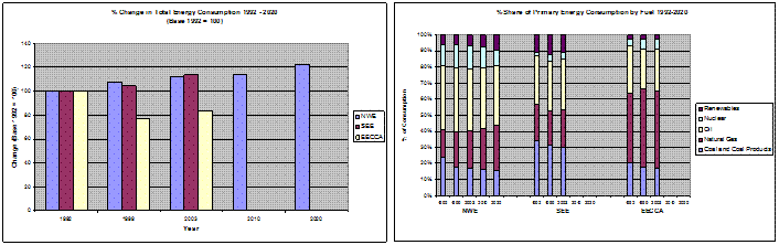 В последующие годы ожидается стабильный рост суммарного энергопотребления, причем темпы роста в Юго-Восточной Европе и ВЕКЦА должны превысить соответствующие показатели в Северо-Западной Европе, несмотря на некоторое дальнейшее разрушение взаимосвязи между потреблением энергии и темпами экономического роста во всех регионах, отражающее смещение в сторону сектора услуг. Таким образом, потребуются действия по минимизации воздействия растущего потребления энергии на окружающую среду посредством расширения мер по обеспечению рационального использования энергии и более широкого применения менее загрязняющих источников энергии.