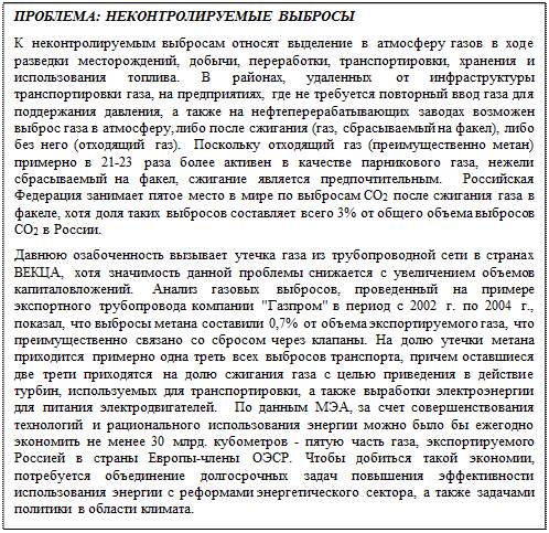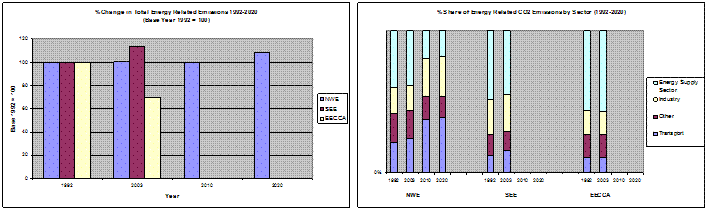 Значительное снижение энергопотребления в регионе ВЕКЦА (Восточная Европа, Кавказ и Центральная Азия) в 1990-х годах, последовавшее за экономическими преобразованиями, привело к сокращению выброса парниковых газов и загрязняющих веществ. В течение того же периода – несмотря на рост энергопотребления – выбросы парниковых газов были снижены в Северо-Западной Европе. Это было обусловлено, главным образом, переходом с угля на газ, повышением эффективности использования энергии, а также введением мер по снижению загрязнения воздушной среды, особенно в энергетике и автотранспорте. С конца 1990-х годов, однако, потребление энергии росло во всех трех Европейских регионах (Северо-Западной Европе, Юго-Восточной Европе и ВЕКЦА). Рост цен на газ повысил конкурентоспособность угля в качестве топлива, а выбросы парниковых газов вновь возросли. Данная тенденция может развиваться, если не будут реализованы новые стратегии и дополнительные меры.