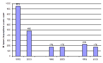 Выбросы кислотообразующих веществ, связанные с энергетикой, 1992 г. и 2003 г.