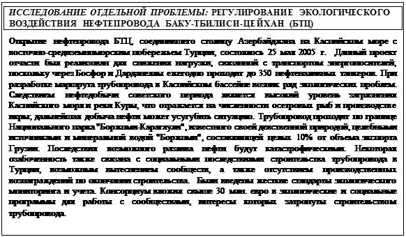 Экологические последствия производства энергии с точки зрения землепользования значительно выше в регионе ВЕКЦА, нежели в ЕС, например, разлив нефти в результате прорыва трубопровода в Республике Коми или сеть протекающих трубопроводов и устьевых отверстий скважин в Каспийском море. Растущие экологические стандарты могут возложить дополнительные расходы на компании, разрабатывающие или модернизирующие эксплуатацию существующих месторождений. Будущие проекты нефте- и газодобычи, особенно в ВЕКЦА, предполагается реализовывать в удаленных районах (Восточной Сибири и Камчатки), где крупные промышленные проекты могут иметь глобальные экологические последствия. Транспортировка как нефти, так и газа, может привести к авариям на трубопроводах или разливам нефти при перевозке в танкерах. (См. также главу 5)