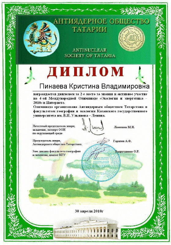 Диплом участника 4-ой Международной Олимпиады «Экология и энергетика - 2010»