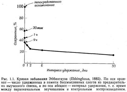 Эббингауз составил ряды бессмысленных слогов, которые nон предъявлял самому себе с некоторой постоянной скоростью. Он читал эти ряды до тех пор, пока ему не казалось, что он их заучил, и в некоторых случаях он действительно мог безошибочно воспроизвести их по памяти. Спустя некоторое время он вновь производил такую самопроверку. Количественной мерой забывания служило число дополнительных повторений, необходимых дл того, чтобы вновь заучить те же ряды по прошествии известного времени. Это позволяло судить, какая часть заученного сохранялась в памяти.
