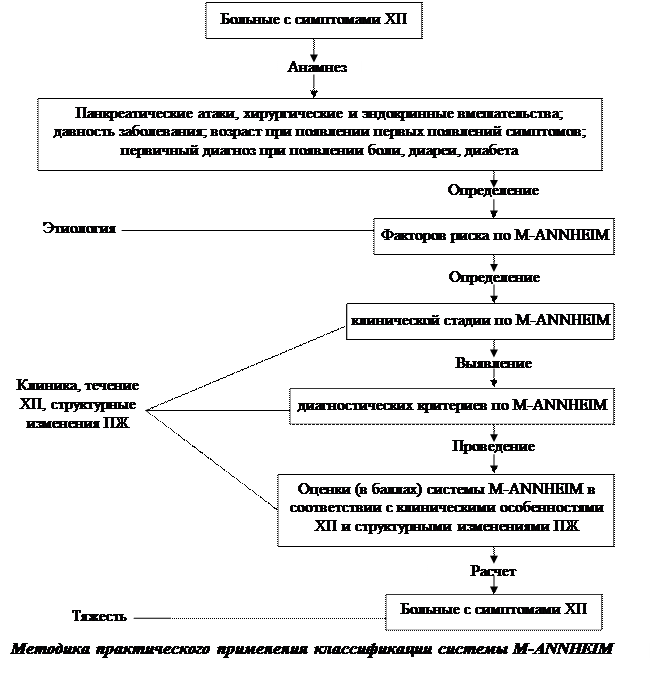Согласно классификационной системе М-АNNНЕIМ, все случая ХП разделяются на «определенный» и «вероятный» ХП с учетом клинических признаков ХП (наличие абдоминальных болей или рецидивирующих панкреатических «атак»). «Определенный» ХП диагностируют при наличии кальцификатов в ткани ПЖ, изменений в ее протоковой системе; появлении клинических признаков экзокринной недостаточности (стеаторея), характерной морфологической картины (УЗИ, КТ). При «вероятном» ХП определяются лабораторные признаки функциональной недостаточности ПЖ (секретинпанкреозиминовый тест, тест с фекальной эластазой-1), а при инструментальном исследовании выявляют псевдокисты (постоянные или рецидивирующие). Иногда находят легкую эндокринную недостаточность ПЖ (по тесту толерантности к глюкозе), а также незначительные изменения панкреатических протоков.