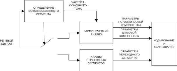 Некоторые сегменты речевого сигнала сложно разделить на периодическую и апериодическую составляющие, используя гармоническую и шумовую модели. Это происходит при попадании в сегмент взрывных звуков, наличии в сегменте одновременно гласных и глухих согласных, присутствии каких-то локальных явлений. Следующей ступенью развития представления речевого сигнала стала гибридная модель [3], предусматривающая три возможных класса для сегмента речи — вокализованный, невокализованный, переходный. Особенностью ее является анализ–синтез переходных сегментов во временной области, в то время как вокализованные и невокализованные сегменты обрабатываются в частотной области.