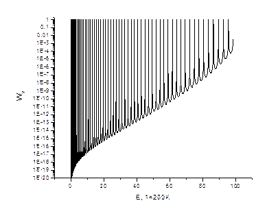 Для расчетов использовалась аналитическая формула для вероятности прохождения через два одинаковых прямоугольных барьера , и аналитическая формула вероятности прохождения одного барьера , как функции от энергии. Характерный вид кривой вероятности показан на рис. 2.