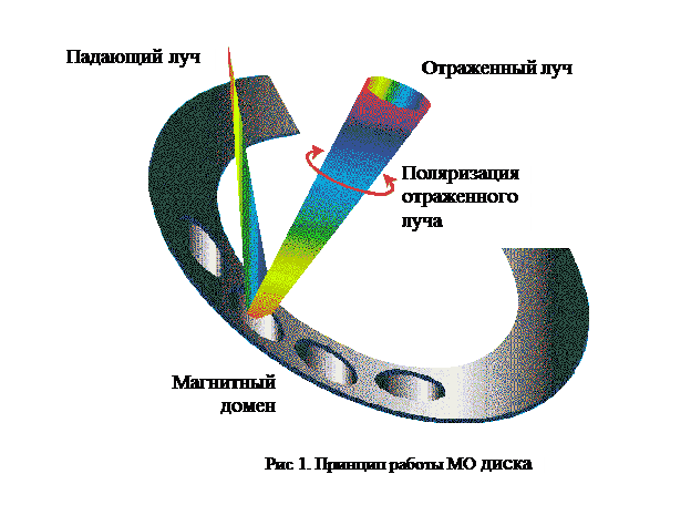 МО накопитель построен на совмещении магнитного и оптического принципа хранения информации. Записывание информации производится при помощи луча лазера и магнитного поля, а считывание при помощи одного только лазера. Его активным носителем является сплав железо и кобальта с добавкой тербия (рис.1).