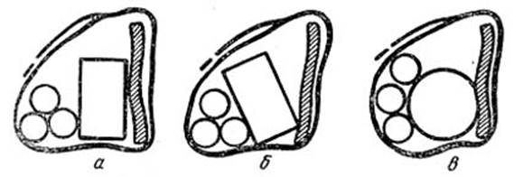 Тяжелые вещи лучше класть вниз, а не сверху и ближе к спине, а не снаружи (конечно, не забывая про мягкую прокладку вдоль спины). Если в рюкзаке остается пустое место, то свободное пространство следует заполнять, укладывая вещи друг на друга, чтобы рюкзак «рос» вверх, а не в ширину. Укладывая рюкзак, надо помнить, что в результате тряски, возникающей при ходьбе, неплотно уложенные вещи начинают смещаться. Вот один из типичных случаев. Кастрюля или ведро, находящиеся в рюкзаке, в нижней части довольно плотно обложены вещами, а в верхней сравнительно свободном (рис. 3,а). Через некоторое время верхняя часть ведра начнет заваливаться назад, и край дна врежется в спину туристки (рис. 3,б). Это же может произойти с пачками сахара, поставленными вертикально, топорами и т. д. Чтобы ничего подобного не происходило, надо соблюдать два правила. Во-первых, стараться уложить вещи, учитывая их центр тяжести, так, чтобы предметы при ходьбе не смещались. Скажем, в приведенном примере ведро можно было бы положить горизонтально (рис. 3,в). Во-вторых, надо уложить вещи так, чтобы они распирали друг друга, взаимно удерживаясь в приданном положении.