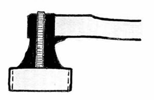 Далее, надо посмотреть, хорошо ли топор посажен на топорище. Очень часто топорища, продающиеся в магазинах, бывают недостаточно высушены, и поэтому при длительном хранении дома когда-то хорошо засаженный топор часто начинает «гулять» на топорище. Работать таким топором небезопасно. Его надо расклинить, забив деревянный или металлический клин в торец топорища. Направление расклинивания выбирается сообразно тому, в каком направлении болтается топор. Деревянный клин нужно изготавливать из плотной сухой древесины и затесывать не очень круто, чтобы он не вылезал обратно. При этом надо следить за тем, чтобы взаимное положение топора и топорища не нарушилось. Что под этим имеется в виду? Обычно плотничий топор насаживается таким образом, что, будучи поставлен на лезвие, он примерно на два пальца поднимает пятку топорища над плоскостью, на которой стоит. Если топорище длинное (например, 60—70 см вместо обычных 50 см), то вполне допустимо, чтобы пятка топорища опустилась ниже или даже коснулась плоскости, на которой стоит лезвие (это не страшно — и таким топором будет удобно работать). Но нельзя допускать, чтобы оно оказалось высоко над этой плоскостью. Кроме того, надо следить за тем, чтобы топор не был завалей вбок. Чтобы оценить это, нужно поднести перевернутый топор к глазу и проследить, лежат ли оба конца лезвия и пятка топорища на одной прямой (рис. 5).