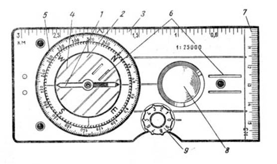 Рис. 7. Жидкостный компас «Спорт-3»: 1 — магнитная стрелка; 2 — резервуар с жидкостью («колба»); 3 — масштабная шкала; 4 — направляющие линии;5 — лимб, подписанный в градусах; б — риски для определения направления движения; 7 — миллиметровая шкала; 8 — увеличительное стекло; 9 — шайба-шагомер.