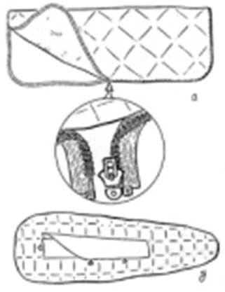 Можно изготовить чехол по образцу тех, в которых продаются цельнометаллические охотничьи топорики. Он красивее oписанных выше примитивных чехлов, но сложнее в изготовлении. На биваке, когда топоры вынимают из чехлов, юные туристы почему-то обычно бросают чехлы на землю и вспоминают о них только на другой день. В итоге одного-двух чехлов не хватает. Следует завести твердое правило: снятый с топора чехол кладется всегда в одно и то же место, удобнее всего — карман рюкзака, в котором несли топор.