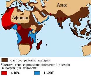 ) и приводит их к гибели в раннем возрасте. В большинстве популяций частота этого аллеля очень низка. Однако он часто встречается в тех районах мира, где распространена малярия. Оказалось, что гетерозиготы по Hbs