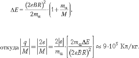 5. Ядро покоящегося нейтрального атома, находясь в однородном магнитном поле индукцией 0,50 Тл, испытывает aраспад. При этом рождаются частица и тяжёлый ион нового элемента. Трек тяжёлого иона находится в плоскости, перпендикулярной направлению магнитного поля. Начальная часть трека напоминает дугу окружности радиусом 78 см. Выделившаяся при распаде энергия 7,44 МэВ целиком переходит в кинетическую энергию продуктов реакции. Найдите модуль отношения заряда к массе для тяжёлого иона.