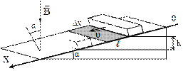 = 0,1 Тл (см. рисунок). Плоскость наклонена к горизонту под углом a = 30°. Продольная ось бруска при движении сохраняет горизонтальное направление. Найдите величину ЭДС индукции на концах бруска в момент, когда брусок пройдет по наклонной плоскости расстояние ℓ