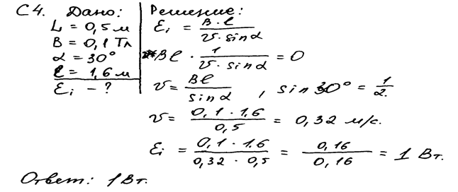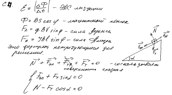 Записаны все необходимые исходные уравнения, проведены преобразования и получен ответ, но при записи формулы для ЭДС индукции в движущемся проводнике ошибочно указан угол. К сожалению, по ходу решения нельзя сделать заключение о том, что эта ошибка соответствует ошибке в преобразованиях. Поэтому считается, что допущена ошибка в одном из исходных уравнений. Работа оценивается 1 баллом.