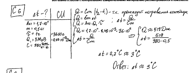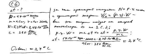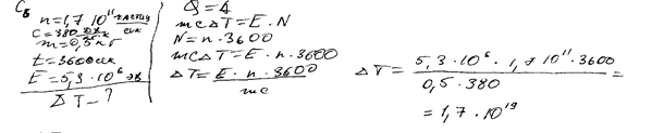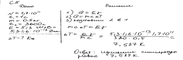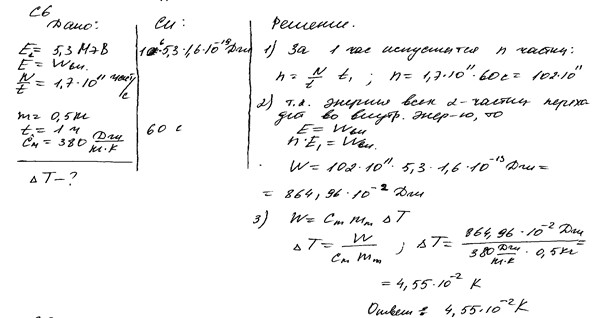 a-частиц в секунду помещен в медный контейнер массой 0,5 кг. На сколько повысилась температура контейнера за 1 ч, если известно, что данное радиоактивное вещество испускает a-частицы энергией 5,3 МэВ? Считать, что энергия всех a-частиц полностью переходит во внутреннюю энергию контейнера. Теплоемкостью препарата и теплообменом с окружающей средой пренебречь.