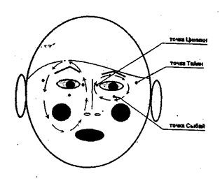 4. «Сухое умывание». Пальцами обеих рук проводят круговое движение от рта к носу, ко лбу и по точке Тайян сбоку. Делая упражнение, считают до четырёх. Каждое упражнение повторяется по четыре раза подряд.