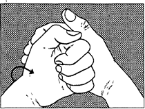 7. С усилием зажмите правой ладонью кулак левой руки с тыльной стороны. Кулак пытайтесь развернуть. Выполните то же для другой руки.