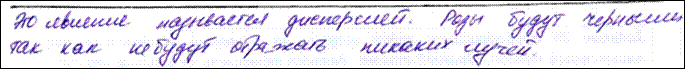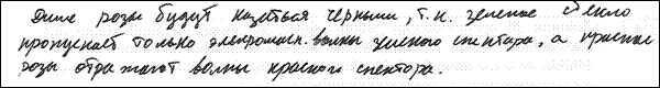 2) Их цвет зависит от света, который попадает к Диме в глаза. Красные розы поглощают все цвета, кроме красного, а красный цвет отражают. Зеленое стекло поглощает весь свет, кроме зеленого. Но зеленого цвета нет в свете, который отражают розы – они его поглотили. К Диме в глаза через зеленое стекло не попадет никакого света от красных роз – они покажутся черными.