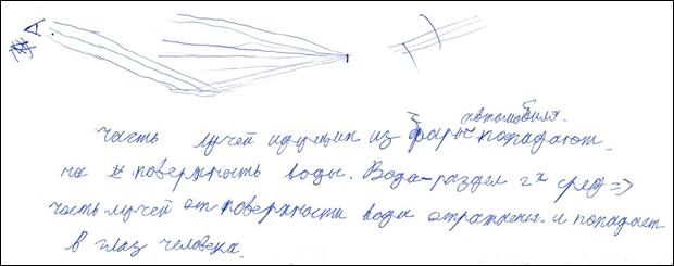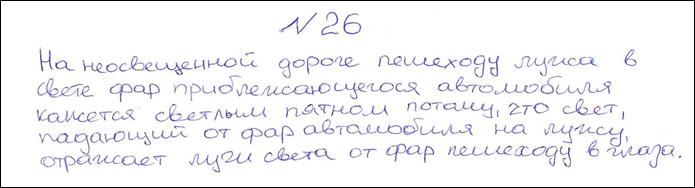 2) И лужу, и дорогу освещают только фары встречного автомобиля. От гладкой поверхности воды свет отражается зеркально, то есть вперед, и попадает в глаза пешеходу. Поэтому лужа будет казаться ярким пятном. От шероховатой поверхности дороги свет рассеивается и в меньшей степени попадает в глаза пешеходу.
