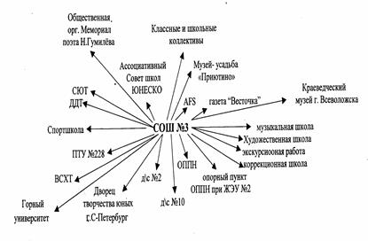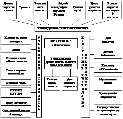 Используя близость Санкт-Петербурга, школа активно сотрудничает не только с учреждениями культуры г. Всеволожска, но и Санкт-Петербурга (см. рис. 4). Чтобы проводимые экскурсии не были хаотичны, создана система посещения музеев и проведения экскурсионных поездок в соответствии с темой года и разработанной программой воспитательной работы по тематическим периодам с 1 по 11 класс (см. табл.1).