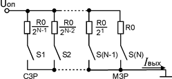 Рис. 1. Простейший ЦАП с суммированием весовых токов