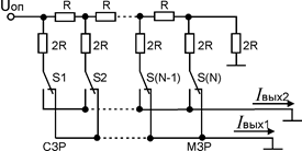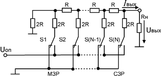 Рис. 2. Схема ЦАП с R-2R матрицей постоянного импеданса
