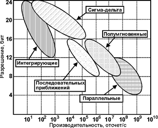Рис. 1. Сравнение различных видов АЦП по разрешению и производительности