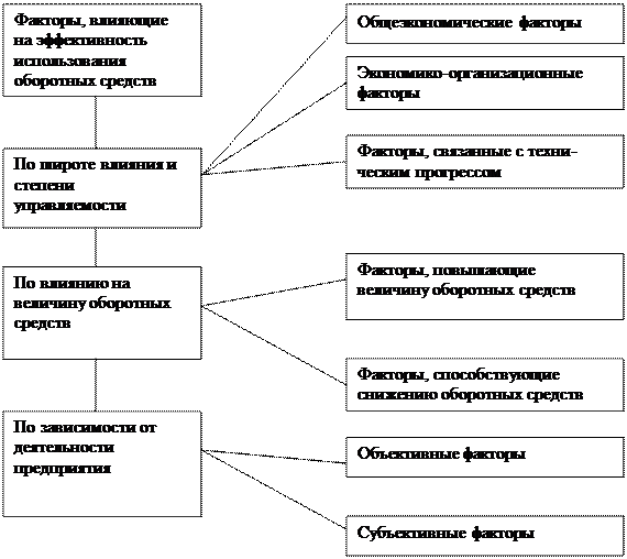 На эффективность использования оборотных средств предприятий действуют множество факторов, нередко в противоположных направлениях (см. Приложение 1.Факторы, влияющие на эффективность использования оборотных средств). По широте влияния и степени управляемости факторы условно можно объединить в три группы: общеэкономические, организационные и связанные с техническим прогрессом.