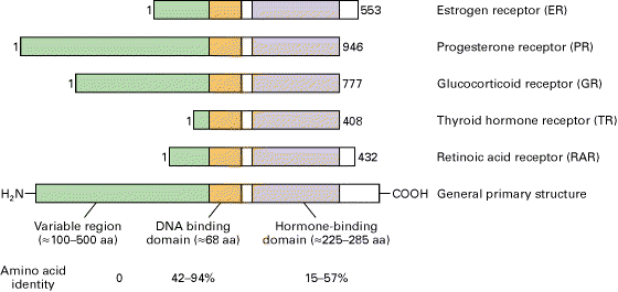 цинк-фингерный домен. Расположенный на С-конце домен, связывающийся с гормоном, проявляет значительно меньшую степень гомологии. Расположенный на N-конце регион вариабелен по длине для различных рецепторов и содержит уникальные последовательности, может содержать один или более активационных доменов. Рисунок составлен для эстрогенового рецептора (553 аминокислотных остатка [aо]), прогестеронового рецептора (946 aо), глюкокортикоидного рецептора (777 aо), рецептора тироидного гормона (408 aо), и рецептора ретиноевой кислоты (432 aо).