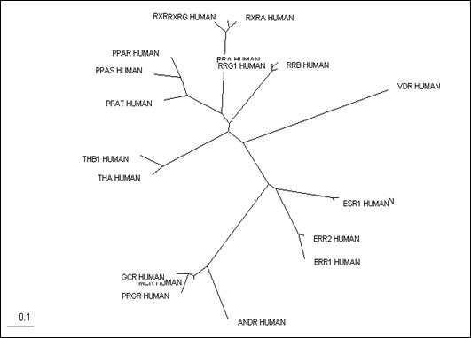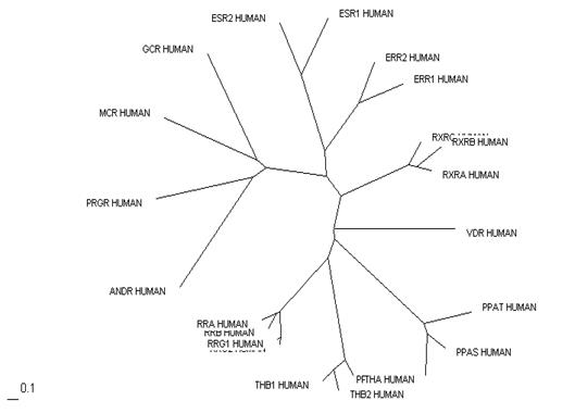 Общей же картиной является разделение рецепторов в зависимости от того, с каким лигандом они связываются, все последовательности разделились на группы эстрогеновые рецепторы- Х-рецепторы ретиноевой кислоты- тироидные рецепторы- PPAR и так далее.