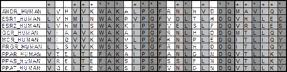 Для найденных записей мы выбирали уже выделенные в SwissProt LBD. Выравнивание проводилось с помощью программы AliBee, матрица выравнивания BLOSUM 62, визуализированы с помощью программы GeneDoc.