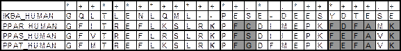 Мы сравнивали первичные структуры LBD PPAR с группами LBD ядерных рецепторов, выделившихся на рисунках 3 и 4. Затем мы вычеркивали консервативные позиции, полагая, что они ответственны за схожесть в механизмах действия. Нам же известно, что ни один белок из рассматриваемых нами, кроме PPAR, не способен связывать циклопентаноновые простагландины, следовательно, в участках связывания не должно быть консервативных позиций.