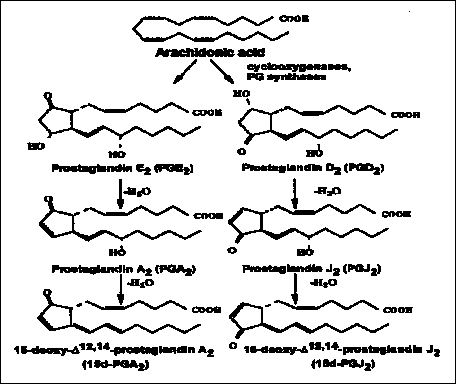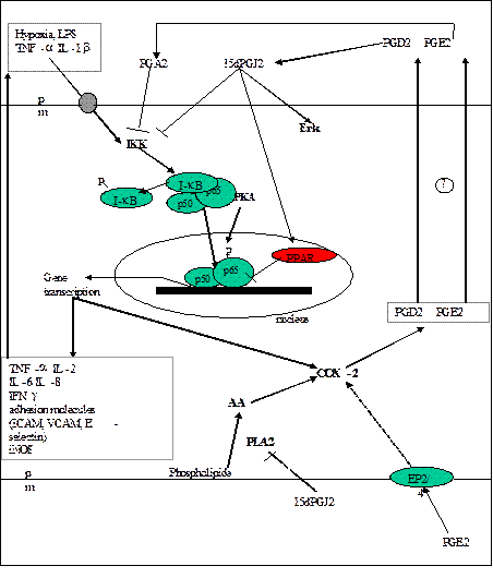 Значительную волну интереса к циклопентеноновым простагландинам вызвало в 1995 году открытие того факта, что 15d-PGJ2 является лигандом-активатором для PPAR [3,4]. PPAR являются членами суперсемейства ядерных рецепторов и включают в себя три типа – PPAR-альфа, бета и гамма. PPAR формируют гетеродимеры с ретиноидным рецептором и активируют экспрессию некоторых генов. Связывание лигандов, таких как 15d-PGJ2 с PPAR-гамма ведёт к активации транскрипции генов, имеющих PPAR-реагирующий элемент, локализованный на энхансере или промоторе. Альтернативно, связывание лиганда с рецептором может вести и к супрессии других генов, включая гены, кодирующие iNOS, TNF, COX-2 [5,6]. Однако существуют доказательства в пользу того, что существует альтернативный, PPAR-гамма-независимый механизм действия 15d-PGJ2. В настоящее время получены данные, что транскрипционный фактор NF-каппаB является также мишенью рецептор-независимой репрессии генов 15d-PGJ2 [7]. Имеются указания на существование других мишеней действия [8].