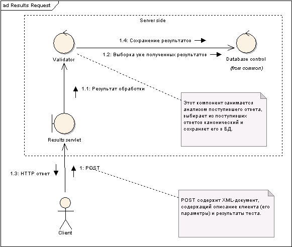 На следующей схеме представлена последовательность взаимодействия основных компонент системы, отвечающих за прием, проверку результатов тестирования и фиксацию полученных сведений в БД.