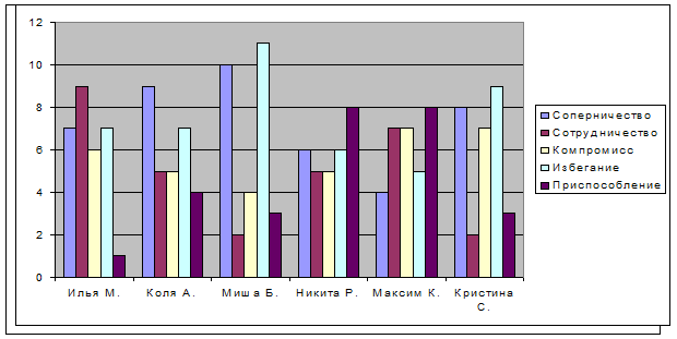 Из таблиц видно, что хотя соперничество и есть в этой группе, но все же сотрудничество и компромисс выходят на первое место в способе решения конфликтов. Компромисс по Томасу – единственный рациональный способ решения, который удовлетворяет всех участников конфликта. Ситуация в семьях контрольной группы спокойная и не напряженная по характеристике учителей. Лишь одна мать приспособляется к конфликтной ситуации, но приспособление происходит наравне с компромиссом и сотрудничеством. Отцы в конфликтах предпочитают соперничество.