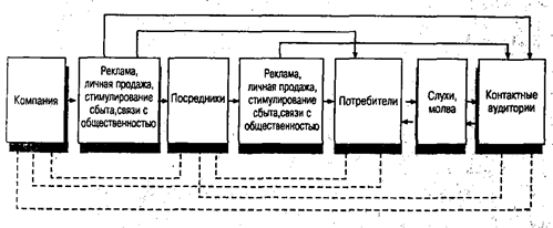 Сегодня в распоряжении компании - комплексная система маркетинговых коммуникаций (рис. 1.1.). Компания общается со своими посредниками, а также с потребителями продукции и различными контактными аудиториями. Посредники обмениваются информацией со своими клиентами и прочими потребителями. Потребители рассказывают о товарах другим потребителям и тем, кто не пользуется данными товарами или услугами. В целом каждый компонент этой системы выступает источником информации для остальных.