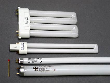 Люминесце́нтная лампа — газоразрядный источник света, в котором видимый свет излучается в основном люминофором, который в свою очередь светится под воздействием ультрафиолетового излучения разряда; сам разряд тоже чизлучает видимый свет, но в значительно меньшей степени. Световая отдача люминесцентной лампы (72 Лм/Вт) ниже, чем у светодиода (90Лм/Вт). Срок службы люминесцентных ламп тоже уступает светодиоду: 7500ч против 100000ч соответственно. Наиболее распространена ртутная люминесцентная лампа. Она представляет собой стеклянную трубку с нанесённым на внутреннюю поверхность слоем люминофора, заполненную парами ртути.