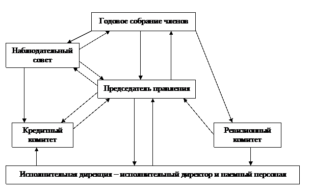 Органами кредитного кооператива являются общее собрание членов кредитного кооператива, правление кредитного кооператива, председатель кооператива или наблюдательный совет. В качестве исполнительного органа в кооперативе может быть создана исполнительная дирекция, а консультационно-совещательного – кредитный комитет.