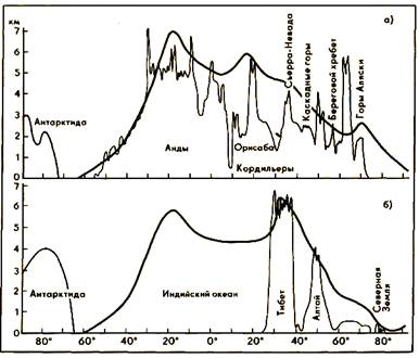Изменение высоты снеговой границы с юга на север хорошо видно на меридиональных профилях вдоль Южноамериканских Анд и Североамериканских Кордильер (а) и вдоль 90—110° в. д. (б).