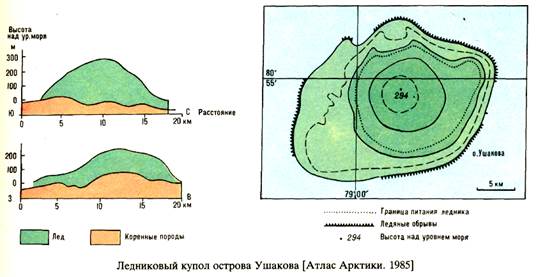 . В центре, где толщина льда достигает 250 м, он поднимается почти до 300 м над ур. м. К периферии купола, имеющего в плане слегка овальные очертания, толщина льда постепенно уменьшается. К морю края купола обрываются ледяными стенами высотой от нескольких до 20—30 м. На севере острова незначительно выдвинулся в море конец небольшого выводного ледника.