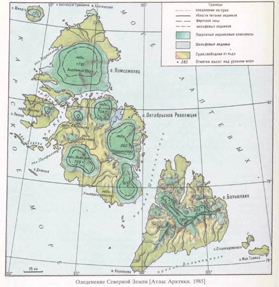 В Каталоге ледников СССР на Северной Земле выделено 17 ледниковых комплексов, включающих 225 ледников общей площадью 17 180 км2