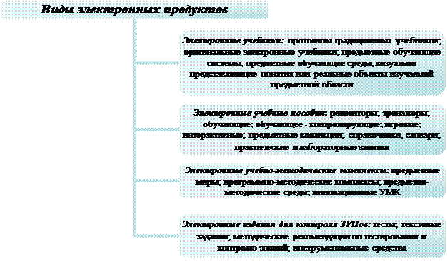 Компьютерные программные средства обучения, или цифровые образовательные ресурсы, помогают вести обучение на новом качественном уровне. Именно вокруг этих учебных материалов формируются новые способы организации учебного процесса. Содержательным стержнем проектов «Информатизация системы образования», стал вопрос создания и использования учебных материалов нового поколения. Были разработаны основные принципы проектирования электронных пособий, группы и виды электронных продуктов.