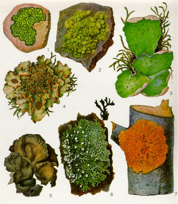 1, 2 – накипные; 3, 4,5,7 – листоватые, 6 – кустистые.