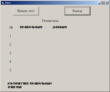 На основную форму я добавил две кнопки (Начать тест, Выход), несколько меток и, используя графические возможности Visual Basic’а, составил таблицу результатов тестирования.