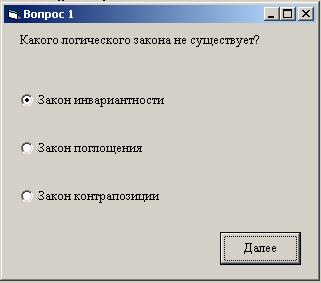 открывается другая форма, содержащая первый вопрос. На ней одна метка, которая представляет вопрос, три зависимых переключателя (варианты ответа) и одна кнопка (Далее